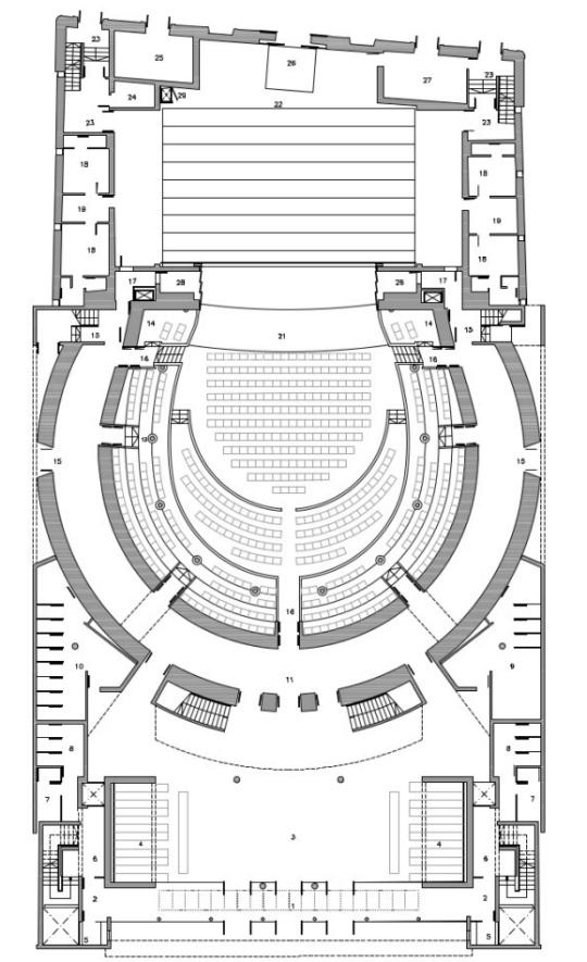 A modo de ejemplo de como es la planta de un Teatro Circo con su patio de butacas normalmente en forma de concha, pongo la del Teatro Circo de Albacete, actualmente en funcionamiento, con una imagen obtenida de su página web oficial.